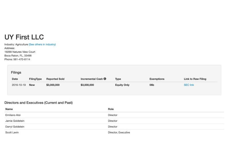 En los registros del estado de Florida, surge que Scott Ian Levin, médico anestesiólogo graduado en 1993 en la Universidad de Miami figura como “director ejecutivo” (Director, Executive) en UY First LLC, vehículo legal radicado en Boca Ratón y vinculado a una colocación privada de USD 3 millones declarada ante la SEC en 2016 bajo la normativa 506(b), destinada al sector agrícola y con fuerte foco en agronegocios y cáñamo industrial.