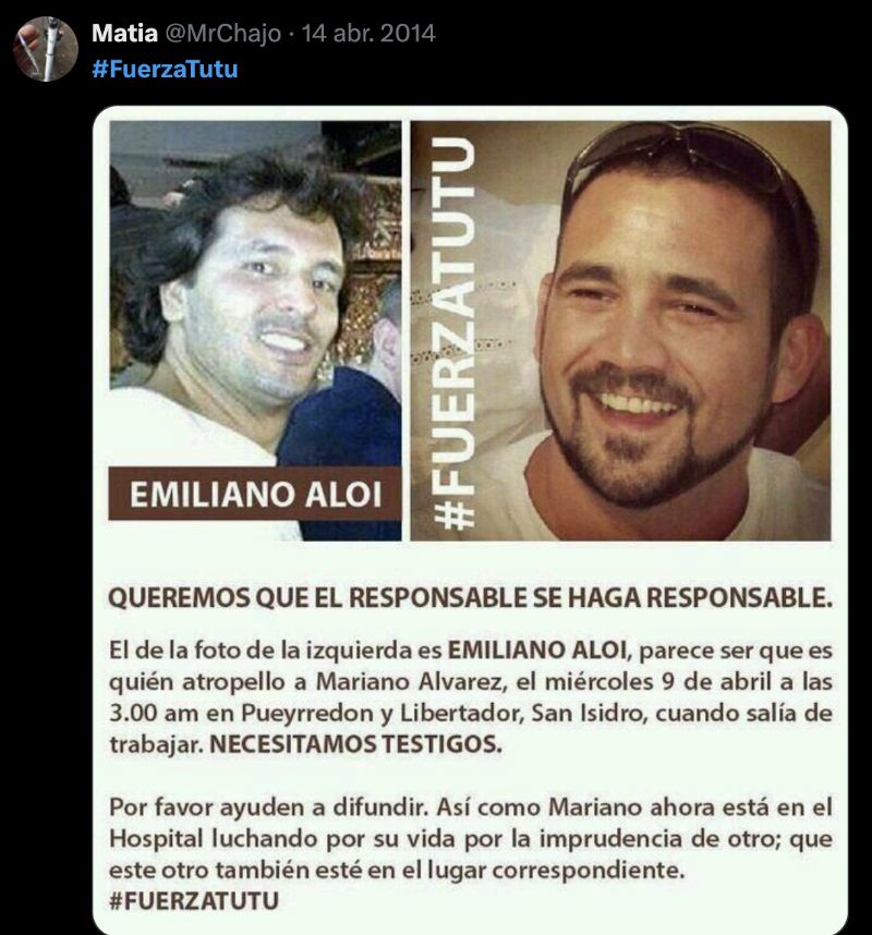 El mensaje señalaba: “A un año y medio de haber destrozado y casi matar a Mariano Álvarez con el auto en estado de ebriedad, sigue manejando libre de culpa y cargo, saliendo del país a su antojo sin restricciones. ¿Esta es la justicia que queremos para nuestro país?”.